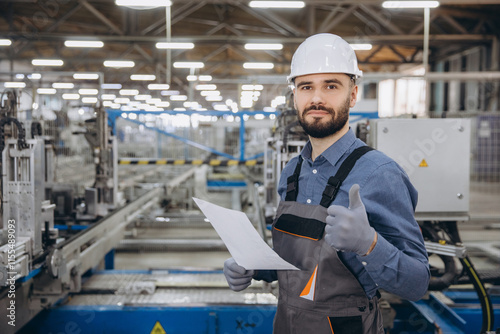 man, industry, factory, men at work, manufacturing, production, metalwork, machinery, engineer, technician, assembly line, aluminium, pvc, window, door, hard hat, uniform, thumb up, quality control, efficiency, occupation, professional, industrial, job, labor, skill, expertise, equipment, technology, metal, steel, construction, building, automated, process, control, supervisor, management, quality, safety, performance, approval, success, positive, motivation, career, employment, workplace, workshop