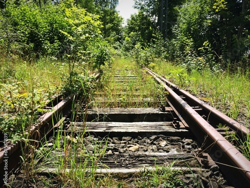 track, track, rail, rail, dead end, train, rail, underbrush, weed