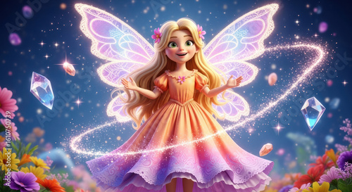 fairy, fantasy, magic, wing, cartoon, illustration, dress, sparkle, floral, flower, crystal, glowing, blonde hair, beautiful, charming, whimsical, happy, smiling, fairy tale, pixie, enchantress, enchantment, nature, garden, colourful, digital artwork, dream, dreamy, creative, art, blossom, spring, light, elegant, vibrant, magical, girl, princess, decorative