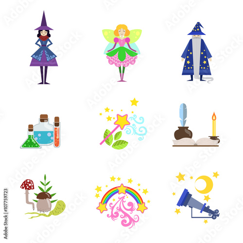 fairy tale, character, collection, set, moon, object, story, tale, legend, fairy, magician, magician, magic, sorcerer, female, person, alchemy, rainbow, star, mushroom, plant, ingredient, book, wand, astrologer, astronomy, girlie, quill, telescope, vector, colourful, flat, cartoon, art, children, cute, illustration, isolated, white, design, sticker, many-coloured, children, print, drawing, image, childish, adorable