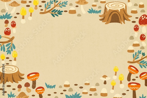 hi-res, downloadable, high-quality, illustration, blank space, environment, background, copy space, aesthetic, botanical, fairy tale, printable, storybook, mushroom, cartoon, fantasy, graphic, autumn, design, forest, jungle, nature, beige, frame, stump, cute, fall, wood