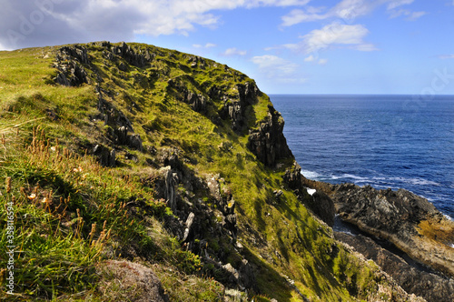 falaise couverte de verdure et rochers sur lesquels la mer bleue indigo vient s'abattre formant une écume blanche, ciel bleu et nuages blancs au nord de l'Irlande.