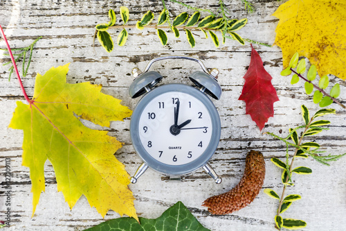 Fall Back Time - Daylight Savings End - Return To Winter Time.Autumn leaves and vintage clock on a wooden background
