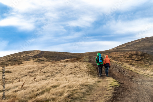 Fall. Couple Backpackers hiking on the path in mountains during autumn.