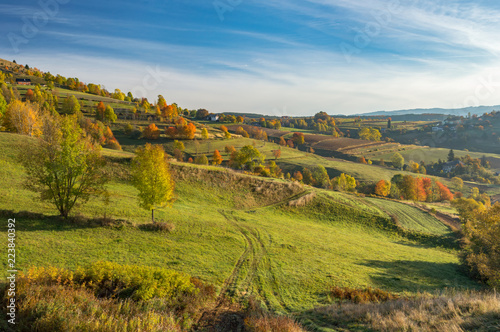 Fall in Slovakia. Meadows and fields landscape near Hrinova. Autumn color trees at sunrise.