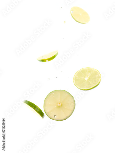 falling, identical, lime, slice, floating, air, isolated, white, background