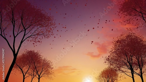 falling leaves, silhouette, sunset, sky, autumn, october, november, 2025, minimalist, red, orange, yellow, purple, pink, vibrant, nature, seasonal, beauty, elegance, simplicity, horizon, dusk, evening, serene, peaceful, tranquil, landscape, environment, weather, editorial, advertising, commercial, travel, tour tourism, scenic, inspiration, relaxation, modern, clean, artistic