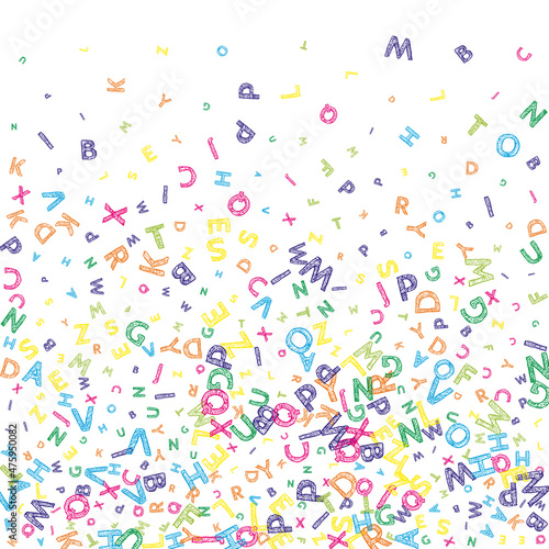 Falling letters of English language. Colorful messy sketch flying words of Latin alphabet. Foreign languages study concept. Optimal back to school banner on white background.