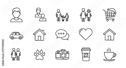 Family and Community Icons Symbolizing Home Car Pets and Relationships