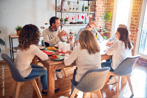 Family and friends dining at home celebrating christmas eve with traditional food and decoration, celebration of festive winter time