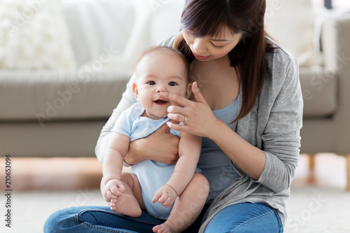 family and motherhood concept - happy smiling young asian mother with little baby at home