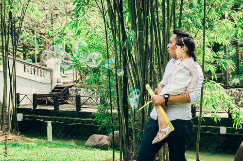 family concept, young father and his daughter with enjoying expression face,having fun at public park.