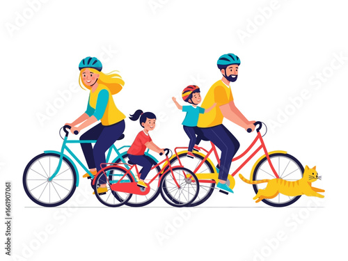 Family Cycling Adventure: A vibrant illustration of a family of four, along with their pet cat, enjoying a cheerful bicycle ride together, symbolizing the essence of togetherness, outdoor recreation.