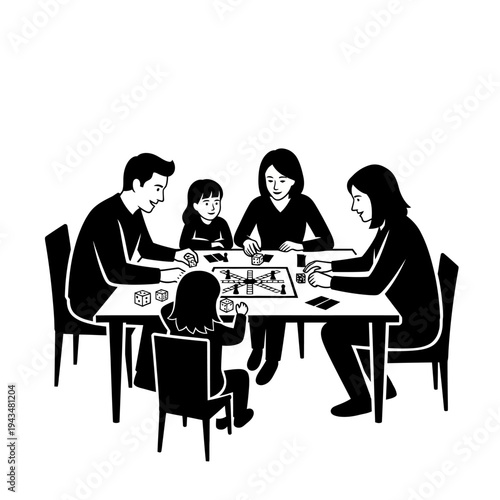 family, meal, dinner, eating, table, home, house, indoor, people, group, adult, children, children, sitting, chair, food, happy, together, love, bonding, sharing, laughter, conversation, enjoying, company, relative, sibling, youth, childhood, domestic, scene, illustration, black, white, silhouette, graphic, vector, clip art
