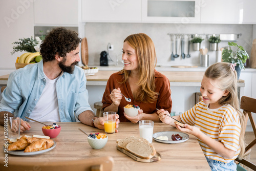 family, enjoying, breakfast, kitchen, setting, three, happiness, smiling, people, adult, children, girl, group, woman, man, yogurt, food, eltern, fruit, juice, drink, meal, talking, quality, healthy, nourishment, morning, caucasian, orange, cereal, granola, elementary, pastry, sweet, sitting, happy, plant, table, plate, father, mother, daughter, eating, togetherness, enjoyment, glasses, bowl, croissant, home