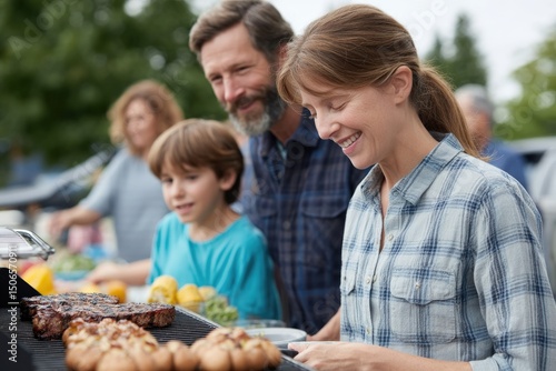 Family enjoying outdoor barbecue, sharing smiles and delicious f