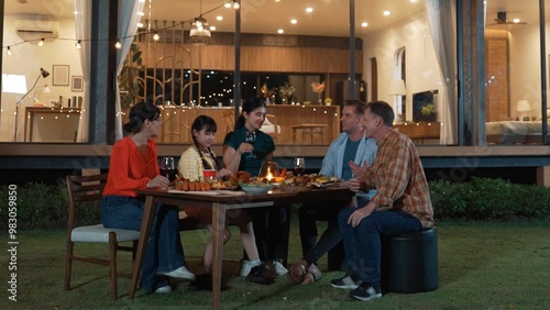Family gather celebrate holiday. Parents, grandparents and girl together to talk and have dinner party food. Outdoor activity for spending time with multigeneration cross generation gap. Divergence.