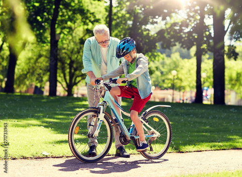 family, generation, safety and people concept - happy grandfather teaching boy how to ride bicycle at summer park