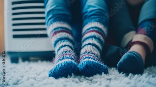 Family in warm knitted woolen socks near a home heater in cold winter time. The symbolic image of the heating season at home. Part of body selective focus.