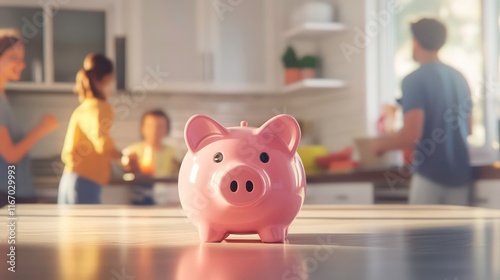 Family kitchen scene with a pink piggy bank in the foreground, symbolizing family savings and financial planning.
