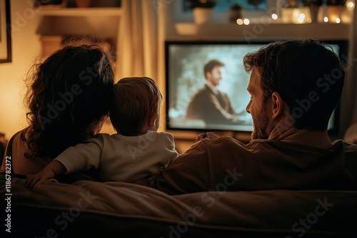 Family Movie Night: A heartwarming scene of a family—mother, father, and baby—cuddled together on a sofa, engrossed in a movie on a large screen TV in a dimly lit living room.