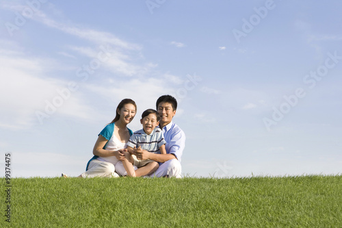 chinese, sitting, grass, meadow, asia, beijing, china, east asia, day, environment, field, nature, horizon, sky, outdoors, clear sky, green, plant, park, lawn, summer, photo, color image, copy space, front view, full-length, portrait, people, leisure, avocation, relaxation, three people, family, eltern, mother, father, offspring, son, husband, wife, boy, man, male, young men, woman, female, missy, children, adult, young adult, affectionate, bonding, care, carefree, cheerful, joy, enjoyment, childhood, comfortable, curiosity, cute, domestic life, excitement, exhilaration, fun, happiness, imagination, lifestyle, togetherness, close to, vitality, loving, satisfaction, content, embracing, side by side, smiling, toothy smile, casual clothes, horizontal, surface level