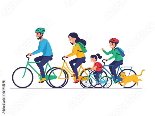 Family on Bicycle Adventure: A happy family enjoys a sunny day, each pedaling their bicycle with joy. The illustration shows unity and the pleasure of quality time together.