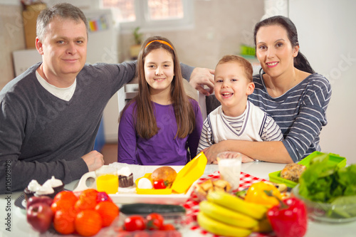 adult, age, apple, banana, breakfast, caucasian, children, colours, colours, cooking, daughter, domestic, elementary, family, father, food, friends, girl, happy, healthy, holding, home, horizontal, image, indoor, kitchen, lunch, man, mid, mother, old, paper, preparing, smiling, son, 30s, together, togetherness, tomatoes, vegetable, woman, year