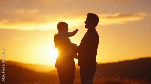 family, silhouette, sunset, sky, gold, warm, light, love, eltern, children, baby, togetherness, outdoors, nature, landscape, horizon, father, mother, sun, evening, happiness, care, affection, people, adult, peaceful
