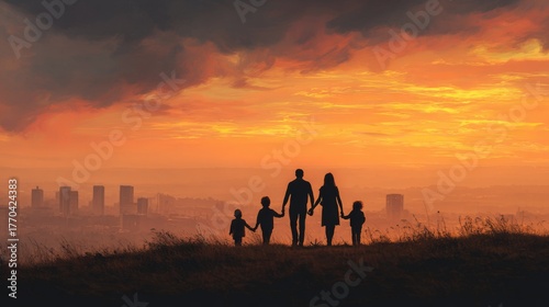 family, silhouette, sunset, city, nature, horizon, landscape, holding, hand, evening, dramatic, cloud, children, together, love, oneness, exploration, joy, sunlight, calmness, peace, connection, moment, scenery, skyline, warmth, beauty, childhood, happiness, adventure, scenic, view, fresh, environment, light, natural, playground, lifestyle, wanderlust, serenity, urban, togetherness, relaxation, freedom, bonding, harmony