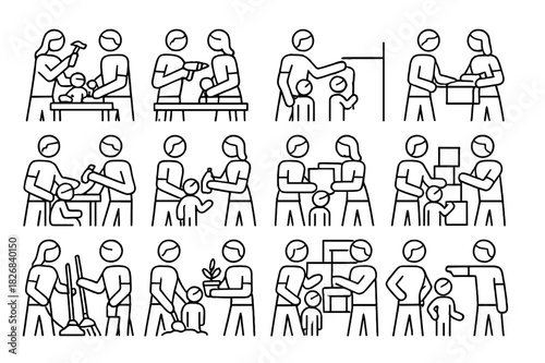 family, task, icon, cooperative, work, line, icon, set, hammering, drilling, painting, measuring