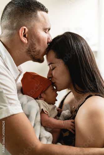 three, adorable, beautiful, children, clothing, father, development, family, fatherhood, growth, happiness, hug, kiss, kissing, love, man, middle, mother, mouth, newborn, parenting, protection, relax, sleeping, small, standing, support, together, union, wife, woman