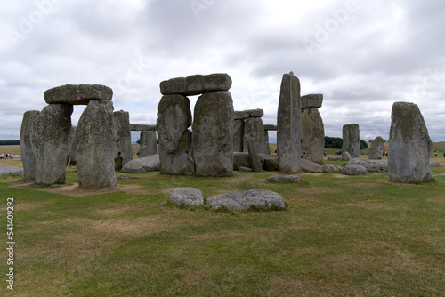 Famous UNESCO World Heritage Site Stonehenge on Salisbury Plain in Wiltshire on a cloudy summer day. Photo taken August 2nd, 2022, Stonehenge, England.