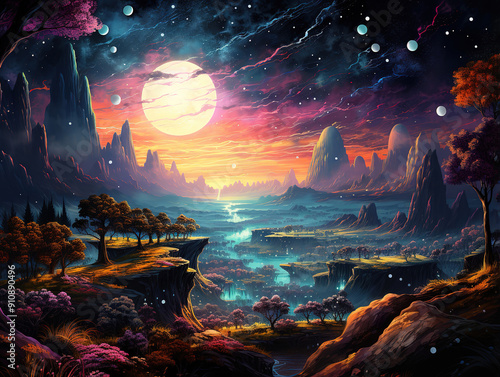 landscape, nature, sky, sunset, blue, scene, sun, fantasy, water, silhouette, star, tree, season, galaxy, mountain, fog, scenery, light, dreamy, sunrise, forest, green, autumn, park, background, beautiful, illustration, cloud, night, morning, design, surreal, dark, high, travel, moon, scenic, adventure, generative, view, peak, vector, sunny, magical, rock, cosmic, texture