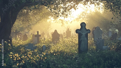 fantasy, three-dimensional, visualisation, cemetery, scene, cemetery, gravestone, eerie, mist, death, horror, landscape, spirit, nocturnal, moonlight, shadow, fantasy art, skittish, haunted, dusk, gothic, architecture, chilling, serene, mystical, surreal, installation, stillness, decay, nature, ghostly, calmness, afterlife, historical building, remembrance, gravestone, design, atmospheric, mythology, fictional, solitude, grisly, twilight, aethereal, imagination, artwork, digital