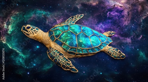 Fantasy cosmic sea turtle with intricate shell design in outer space setting