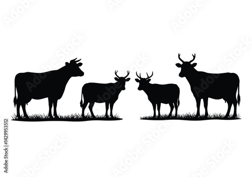Farm animal silhouette. This image shows the silhouette of four farm animals standing on grass, known as cows or bulls, symbolizing livestock and rural farming. Vector clipart illustration design.