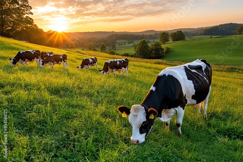 Farm Cow Grazing Field, Herd, and Sunrise shown in a serene morning scene where a herd of cows grazes in a field as the sun rises, casting a golden light over the landscape