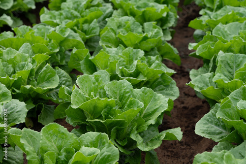 Farm field with rows of young fresh green romaine lettuce plants growing outside under italian sun, agriculture in Italy.