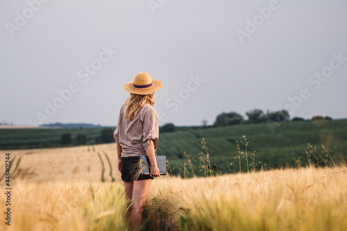 Farmer inspecting and examining agricultural field before harvest. Woman with straw hat and digital tablet standing in barley field