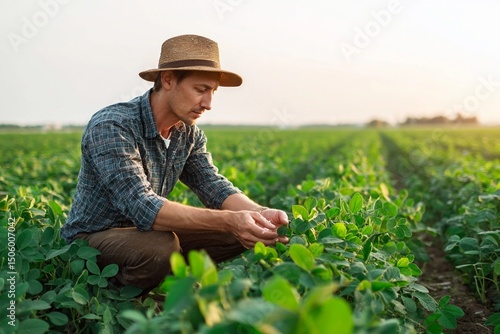 farmer, crop, soybean, field, summer, sunset, agriculture, nature, green, inspection, plant, rural, land, farming, harvest, growth, dirtied, environment, lifestyle, work, cultivation, gardener, landscape, care, sustainability, sunlight, hobby, labor, plant health, dedication, hard work, nature conservation, earth, organic, produce, harvested, tractor