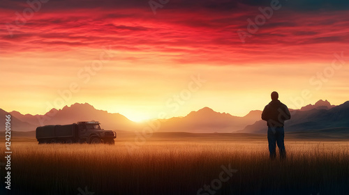 Farmer silhouetted at sunrise, truck in field, mountain backdrop; agriculture, landscape