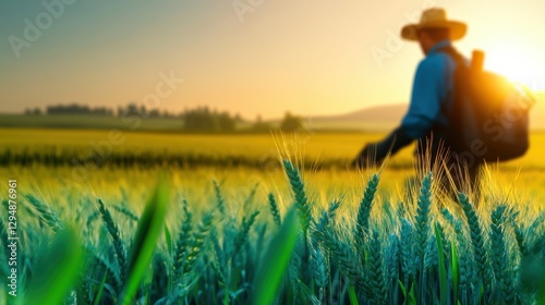 Farmer walking through wheat field at sunrise rural landscape photography peaceful environment close-up view nature's majesty