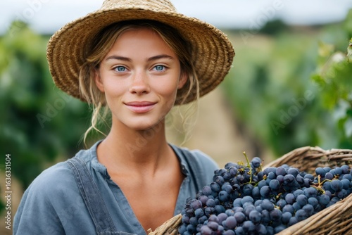 grape, vinery, harvest, farmer, woman, agriculture, farming, wine, fruit, food, basket, nature, rural, countryside, picking, fresh, ripe, organic, farm, produce, vine-growing, autumn, summer, vinification, grapevine, sunny, outdoors, healthy, smile, happy, portrait, leghorn, blue eye, job