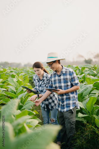 Farmers inspecting crops with a digital tablet in Tobacco leaf plant grow at field, showcasing modern agriculture, teamwork, and technology.