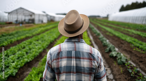 Farmland with vegetables growing, a wide shot of a young farmer wearing a hat and checkered shirt looking at the vegetable field from behind. In the background is a greenhouse. The