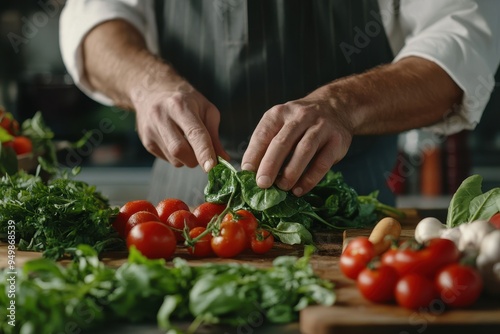 Farm-to-Table Concept: A rustic kitchen scene where a chef is preparing a meal with freshly harvested vegetables. The focus should be on the vibrant colors of the vegetables and the hands of the chef