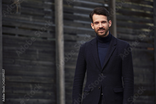Fashion beard style business handsome male model posing in style clothing blue jacket and trousers on street wooden wall outdoors background.
