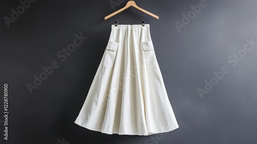fashion, beauty, style, casual attire, clothing, skirt, long, white, pocket, hanger, dark, grey, minimalist, trendy, chic, summer, lightweight, fabric, comfortable, fit, everyday, outfit, versatile, photo, evening, wear, effortless, sophisticated, modern, clothes rack, staple, seasonal, stylish, silhouette, feminine, aesthetic, elegance, relaxed, bohemian, vibe, easy, posh, attire, street, contemporary, icon, tailored