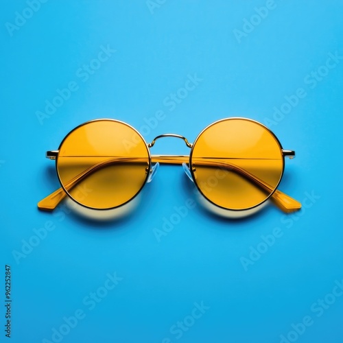 Fashion Color For Spring Summer 2024. Trendy Sunglasses in Marigold Colour on Blue Background